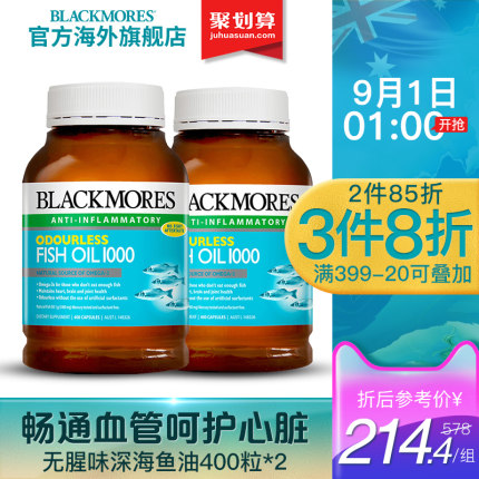 Blackmores 澳佳宝 原味深海鱼油软胶囊,每瓶400粒装,每粒胶囊含天然鱼油1000mg、Omega-3海洋甘油三酸酯300mg(EPA 180mg、DHA 120mg),能降低甘油三酯,有益心脏健康,增加记忆力。BLACKMORES海外旗舰店售价¥268,可领70元优惠券,实付198元包邮,折合99元/瓶。