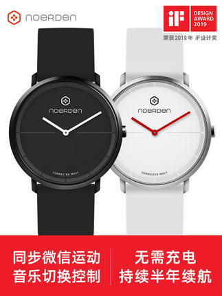 荣获2019年iF设计奖,瑞士智能机芯,感应式外壳,支持运动分析、睡眠监测、震动提醒、音乐切换等黑科技功能,无需充电,180天续航。这款NOERDEN 牛丁 LIFE2 指针式多功能智能手表,依旧搭载瑞士机芯,确保指针的精密走时。新增敲击屏幕,控制音乐播放功能。多彩表盘与硅胶表带,时尚简约。38MM的不锈钢材质,坚固强硬;表镜采用双曲面设计,视角更广,更清晰。搭载低耗点纽扣电池,续航3-6个月,轻度使用6个月,可自行更换电池。智能省电,蓝牙连接断开2小时候,手表自动关闭蓝牙,进入省电模式。50M生活防水,无拘无束。支持运动分析、睡眠监测、震动提醒、闹钟、来电拒接、手机查找、遥控拍照等10项智能功能。