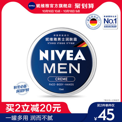 妮维雅 男士 蓝罐润肤霜 75ml,天然植物精华,双重滋润,有效补水,持久保湿,改善干燥缺水肌肤,淡斑并改善肤色不均,肌肤水润弹嫩!nivea妮维雅官方旗舰店领券拍下35元包邮