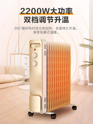 这款美的 NY2213-18GW 电热油汀取暖器,采用高强度钢材制成的一次成型油汀片,13片新型专利镂空散热片同时升温,每片散热片上都有18个散热孔,能加速热量散发,30min升温速度比普通散热片快21.2%。内含优质中石化导热油,能高效升温,沸点高、流动性好、冷区时间长、效率高、导热性好,长期安全稳定工作,断电也能长时间维持热量,为你节能省电。还拓宽了油路设计,提高导热油流动与热量传递速度,散热片升温速度较传统油路提升10%。尾端是双独立隔温尾片的安全防烫设计,双尾片温度比普通散热片温度低20℃。2200W大功率,在同样取暖效果的情况下,电热油汀的功率越大,效果越好。无极旋钮调温,到设定温度后机器自动停止加热,温度降低自动启动,维持室内温度平衡,告别忽冷忽热,同时也更省电。搭配烘衣架使用,可烘衣服、烘秋裤、烘袜子,烘毛巾;有多种安全保护,防烫后壳,过热保护,倾倒断电,防冻结保护,无光无辐射,防火用料;自带轮子设计,随时移动更加方便。