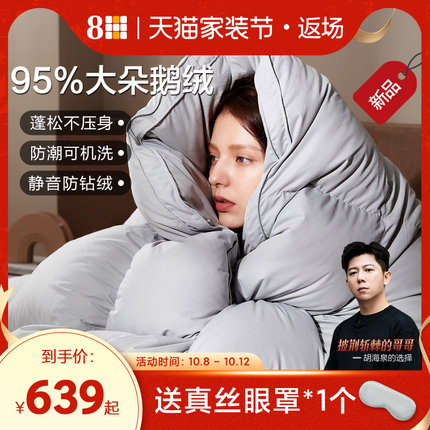 防潮可机洗,优质95白鹅绒天猫精选原价1189元,满200-30元,领取440元优惠券,到手价599元包邮。白鹅绒填充,静音防钻绒工艺,优质95白鹅绒,睡得温暖蓬松,可机洗的鹅绒被,蓬松不压身。优质的鹅绒被温暧蓬松,睡感舒适,但一旦遇水,保暖性能便大大下降,清洁成为一大难题。8H攻坚克难,突破技术难题,让鹅绒被可机洗,保证鹅绒被温蓬松的同时,更让你从容清洁护理。可机洗的鹅绒被,科技打破传统技术释放双手。传统鹅绒被保暖性能易受潮湿水汽影响,经机洗瞬间报废,无法使用。为此,我们创新使用纳米拒水技术,以新科技使鹅绒拒水不易溯,为鹅绒被可机洗提供技术前提。纳米拒水技术,防潮水洗真科技。纳米拒水技术源自瑞典,将纳米材料经多重工艺处理,使其牢固附着于羽绒表面,增加了羽绒的疏水能力。经纳米拒水技术处理的羽绒,水洗后也能保持温蓬松,保暖性能不受影响。95%细腻鹅绒填充,蓬松保瞹机洗无负担。含绒量是决定鹅绒质量优劣的重要指标,鹅绒含戎量越高,鹅绒被保温效果就越好,机洗后也更易保持性能。8H采用每只鹅仅能获取30g,左右的珍贵大朵腹部鹅绒填充鹅绒被,95%的含绒量品质优越,保暖出色。北纬45°的纯净暖感,睡于云端陷于温暖。源于北纬45度,黄金产绒带,正负70度温差加之纯净空气滋养,造就了绒朵饱满,轻盈细腻的高御寒鹅绒。躲入鹅绒保暖被中,寒冷被轻暖拥抱融化,扫除疲惫,安享一夜香甜好梦。1000+洁降德国CHT除臭,每一寸羽绒洁白纯净。8H精选优质鹅绒,经10多道专业清洗处理工艺,采用德国CHT除臭技术,保证鹅绒的纯浄、清雅、无味不生螨虫不易潮湿发霉。 鹅绒的清洁度高达1000+mm,是国家清洁度标准两倍,睡眠更加洁浄安心。精选的TTC复合防羽面料,采用60支细密纺织工艺织就。除了顺滑柔软的特性外,面料之间绵柔贴合,不会产生摩擦声响,顺滑静音,带来静谧享受。