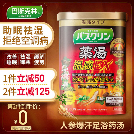 天猫Bathclin海外旗舰店125元,下单立减50元,可领15元优惠券,实付60元到手,规格是600g。这款巴斯克林 生姜泡脚粉,日本进口,将16种天然中草药活性成分,与日本独有的天然温泉矿物盐混合,并加入有机认证荷荷巴油,既保证药用疗效又能保护皮肤不受草药刺激影响,两全其美。不添加人工色素、防腐剂、添加剂,对皮肤无刺激。16种中草药成分包括人参、川芎、当归、鱼腥草、生地黄、茯苓、生姜、山金草、连翘、牛蒡、陈皮、水芹、常春藤、大蒜、松花、洋甘菊。
