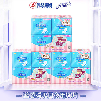 安尔乐卫生巾,蓝芯柔棉日夜用60片装套包姨妈巾,内含245mm*15片*3包 275mm*5片*3包