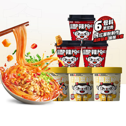 酸辣粉尝鲜杯、锅巴酸菜粉两口味,还有混合装可选。纯正红薯粉,国际粉涂布工艺,新鲜无氧化,顺滑不易断节,非油炸0添加,Q弹劲道。酸辣汤底,醇香开胃,桶装易冲泡~