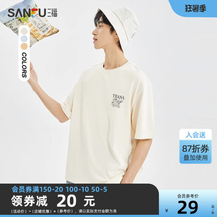 2023新款t恤,青春活力风格,宽松版!纯棉,穿上满满的青春气息,很多颜色和图案可以选择。目前天猫商城三福优选旗舰店售价¥49起,可使用¥20优惠券,券后实付¥29包邮起,多款多色可选。