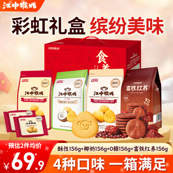 四种口味,一箱搞定。目前京东江中食疗旗舰店售价69元,领取满99减30元优惠券,PLUS会员8.3折,下单2件,实付84.54元包邮,折42.27元/件,礼盒内含:经典酥性156g+富铁红养156g+椰奶酥性156g+0糖酥性156g,入手好价。