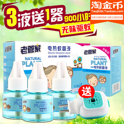 【9.6元包邮(需用券)老管家 无味电热蚊香液3瓶套装送加热器】