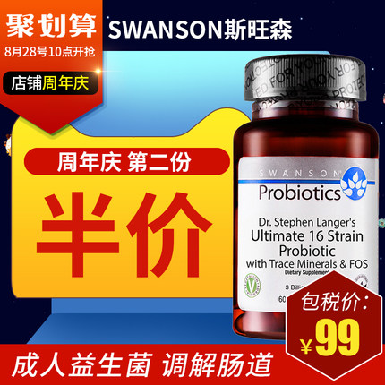 美国斯旺森畅销全美47年,2010-2016连续7年蝉联美国消费者最满意产品。 斯旺森16种益生菌每粒含16种活性益生菌 30亿活性微生物,可以调节肠胃健康,缓解便秘腹泻,增强抵抗力。适合腹泻便秘、胃口差、身材消瘦、免疫力低下、易疲劳、胃胀 消化不良、新陈代谢慢、超重、肠胃敏感易不适人群服用。活的益生菌,大人小孩都能吃,全家肠胃,一瓶搞定。 现商家swanson斯旺森海外旗舰店 售价99元,领取20元优惠券,实付79元包邮。