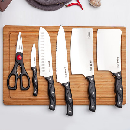 家用刀具七件套装,采用优质高碳复合钢,快速切削,久握不累,不生锈的菜刀,让最普通的烹饪爱好者,也能拥有不赖的刀功。刀身为一刚到底设计,使用时平衡感更佳,切用料更多。配合时尚美观的桦木插刀架,时尚美观。