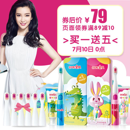 舒客 声波儿童电动牙刷 带4个刷头、3支牙膏,目前天猫商城 saky舒客薇美姿专卖店售价¥89,叠加¥30优惠券,券后实付¥59包邮到手,2种款式可选,赠品包括刷头和牙膏,培养孩子良好刷牙习惯。