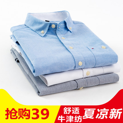 这款衬衫为牛津纺面料,100%棉材质,吸湿透气,手感柔软舒适,抗皱易打理,尺码范围38-44码,具体尺寸可参考页面内尺寸表,长短袖及多种颜色可选,原价29.9元,可领取10元优惠券,实付19.9元包邮到手