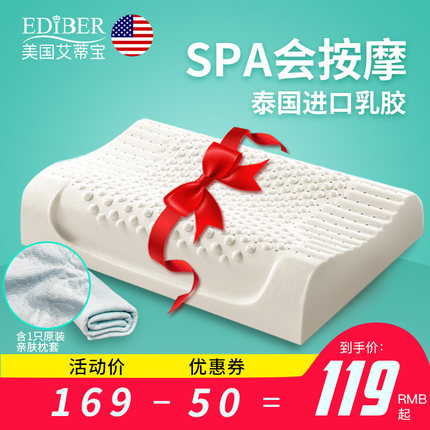 天猫ediber艾蒂宝旗舰店 小号款(50*30*9/7cm)169元,可领100元优惠券,拍1件实付69元到手,满288元还可减70元,即拍2件168元。大号款(60*40*12/10cm)1件券后89元,拍2件208元。这款乳胶枕优选泰国进口乳胶原液,乳胶含量高达85%并采用美国TALALAY发泡科技工艺,即真空物理发泡,抽真空和冷冻,耗能和技术要求高,成本高,发泡而成的乳胶海绵属于开孔结构,弹性、透气性更佳,可帮助快速进入深度睡眠。根据人体工学,设计了高中低护颈曲线设计,科学曲线与人体头颈肩部自然生长曲线舒适贴合,多方位分解颈部压力。乳胶枕上是颗粒按摩设计,还可以帮助颈椎按摩。并选用运用于贴身运动服的科技感面料作为枕芯内衬,可以更好的放大枕芯的膨胀感和慢回弹效果,而且吸湿排汗、透气舒爽。