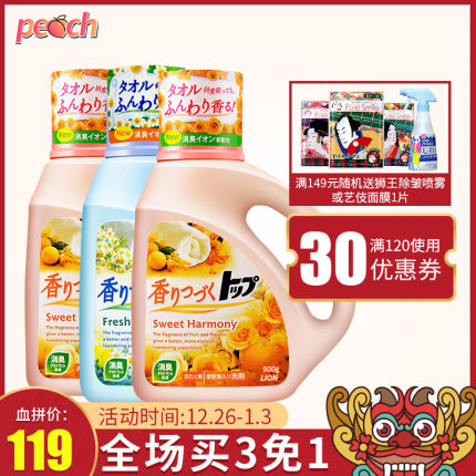 【天猫国际:日本 狮王香氛柔顺洗衣液 900g*3瓶 劵后79元包邮】