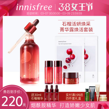 济州石榴活妍焕采菁华露焕活套装,包含:济州石榴活妍焕采菁华露 50ml;济州石榴活妍焕采保湿水<非卖品>15ml;济州石榴活妍焕采保湿乳<非卖品>15ml;济州石榴活妍焕采凝珠面霜<非卖品>10ml;悦享鲜萃面膜[石榴]<非卖品>25ml*2片。打造Q弹充盈肌肤,焕发健康光采!!去黄亮肤+紧致抗初老+淡化细纹+提拉紧致+增强弹性,用对精华,肌肤不见年龄!