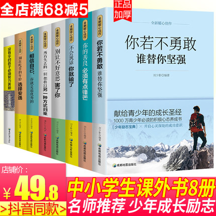 天猫小火苗图书专营店49.8元,可领20元优惠券,实付29.8元到手,包括《你若不勇敢谁替你坚强》+《你的善良必须有点锋芒》+《别在吃苦的年龄选择安逸》+《没有伞的孩子必须努力奔跑》+《别让不好意思害了你》+《不会说话你就输了》+《相信自己你就是最优秀的》+《所有失去的一切都将以另一种方式归来》。这八本书是升级加厚版的,是新书新版,字迹很清晰,印刷很精美,并且不会脱页。是青少年必读的课外书,可以帮助他们养成积极健康的心态,给他们的青春送去满满的正能量和温暖。
