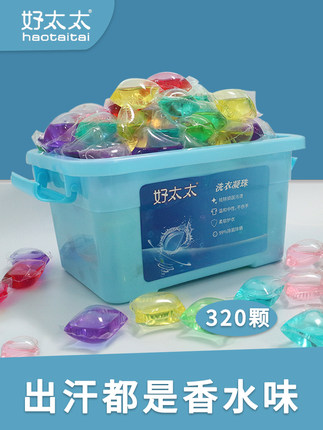 好太太洗衣凝珠~高浓缩的,1颗可洗4-6件衣服!内含多种活性因子、去渍剂和柔顺剂,洁净力强,轻松瓦解油渍泥渍,护衣更护色!