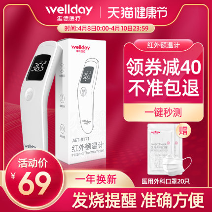 天猫维德医疗旗舰店109元,点此领取50元优惠券,实付59元到手,一秒测温,可连续多人、多次测量,非接触测量,居家常备。下单赠10只医用外科口罩。