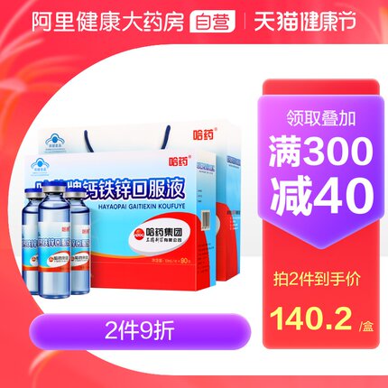 【阿里大药房,蓝瓶的好喝的:10mlx90支 哈药 钙铁锌口服液 148元包邮(原价280元)】