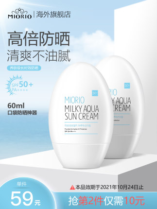 临期到10月24日,不过胜在便宜,60ml装用完也问题不大,SPF50+,PA+++,清爽不油腻。天猫国际 MIORIO海外旗舰店售价¥59,第2件10元,叠加¥30优惠券,拍2件实付新低¥39包邮包税到手。