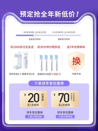 备注666送2个原装刷头+1酵素牙膏+1牙刷支架,舒克电动牙刷,刷超软刷毛,敏感牙龈也可以用!声波洁牙,健齿净白,高频震动,智能计时,快速清洁,五档净白模式,全身防水!给你的牙齿做个SPA! 此款商品正在进行限时活动,原来天猫售价169元,现有40元优惠券,到手仅需129元,绝对超值!