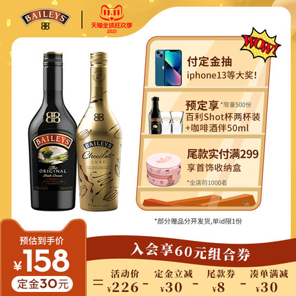 百利甜酒baileys 原味500ml+巧克力500ml洋酒 预售定金+尾款176元包邮