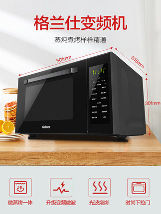 下拉门设计 变频微波炉 微蒸烤三用。格兰仕 AB1-GF3V 微波炉,时尚的外观,23L容量,800W大火力,陶瓷宽广大平板,加热均匀,速度快,可用空间大,易清洁。高效变频,节能高效。方便快捷一键启动,老人小孩都会用。智能美食菜单,变出幸福百味。产品尺寸:303*504*399mm