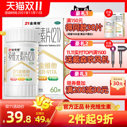 =29.8元 到手价,规格是60片装。每天两粒 补充身体所需,阿里健康大药房出品,产品质量有保障。维生素和矿物质均为维持机体正常代谢和身体健康必不可少的重要物质,缺乏维生素可导致代谢障碍而引致多种疾病。这款21金维他 多种复合维元素片,包含赖氨酸和20种易缺乏的维生素矿物质,补充每日身体所需,