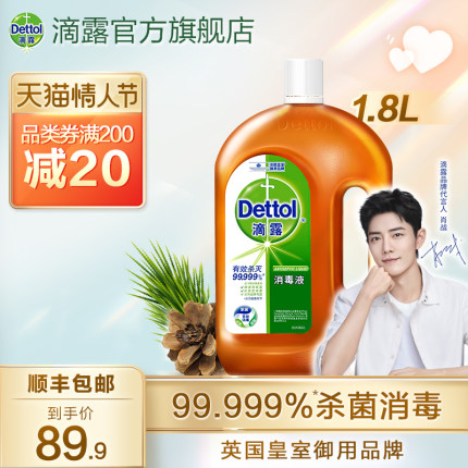 =69.9元 到手,规格是1.8L。99.999%*有效杀菌 温和不刺激。滴露消毒杀菌大品牌,英国皇室御用品牌。这款滴露杀菌消毒液,可兑水用于伤口消毒,也可以用于地板消毒、衣物消毒、家居消毒等。主要有效成分是PCMX,可有效杀灭99.999%的大肠杆菌、金黄色葡萄球菌等有效细菌,含有清香松油,淡淡清香;