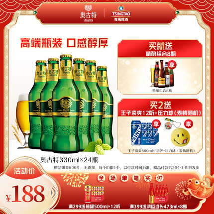 青岛一厂出品,青岛啤酒高端线,超市零售价13元/瓶。目前天猫商城奥古特旗舰店330ml*24瓶整箱售价¥188,可使用¥25优惠券,实付¥163包邮,下单赠精酿组合8瓶(订单可见,赠品不随单,单独发货)。