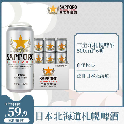 日本进口 三宝乐Sapporo 札幌啤酒 500ml*6听 39.9元包邮