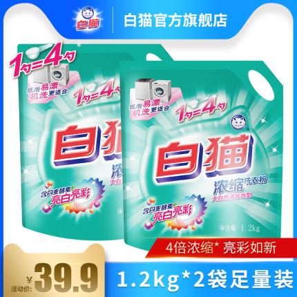 天猫whitecat白猫旗舰店39.9元,可领10元优惠券,实付29.9元到手。白猫浓缩洗衣粉,1勺=4勺,亮白亮彩,低泡易漂,机洗更适合,4倍浓缩,亮彩如新,双“酵”合一,去渍护色。