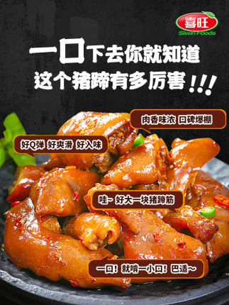喜旺是酱卤肉制品国家标准起草单位。这款无骨肘子卤味蹄髈,300g,新鲜现做零添加,没有防腐剂,无骨满满都是肉,天然香料卤制,开袋即食。目前天猫商城特价49.9元,叠加10元优惠券,实付39.9元包邮