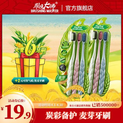 荣获国家实用新型专利,CBE中国好品牌奖,GTM好设计奖,麦纤维环保健康,竹炭软毛深层清洁,细柔软毛深入齿缝,齿面全覆盖。目前天猫商城刷牙大师旗舰店 6支装售价¥29.9,可使用¥20优惠券,实付¥9.9包邮,同款京东自营3支装就要¥19.8,差价值得入手。