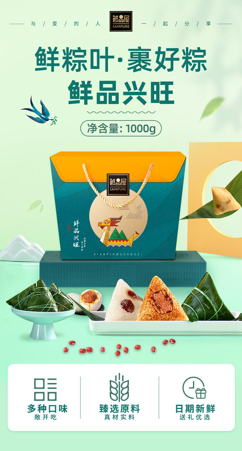 这款臻味 鲜品兴旺 端午粽子礼盒1kg,内含蛋黄肉粽140g*1、经典鲜肉粽140g*1、红袍豆沙粽100g*1、黑三宝粽100g*1、金丝蜜枣粽100g*1、海鸭蛋70g*4。