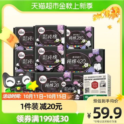 包含护垫150mm*20片+日用240mm*40片+夜用280mm*12片+夜用420mm*6片+赠日用16片[酷]澳洲进口纯棉,0.08cm极薄吸收芯,不含荧光增白剂、重金属等,触感柔软,轻薄透气。