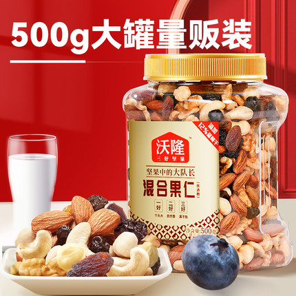 沃隆每日混合坚果罐装500g【下单立减10元,领劵减2元,到手最划算】精选全球6种优质坚果,500g大罐装,让你一次吃到爽,双层密封设计,防潮锁鲜,更利于储存,纯进口原料,只挑选的那当季新果,让大人小孩吃的更放心。