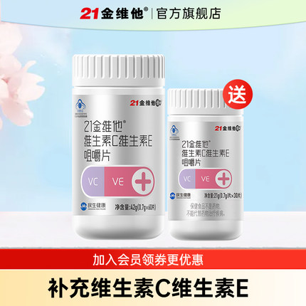维生素C和维生素E同补,目前60片装天猫商城21金维他旗舰店售价¥79.9,叠加¥60优惠券,券后实付¥19.9包邮,再送30片*1瓶,到手共90片。