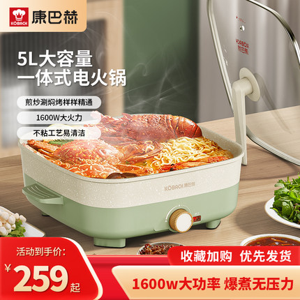 康巴赫 多功能一体式电火锅,1600W大功率,食品级不沾涂层,360°环形加热~煎煮炸烤四合一。目前天猫商城康巴赫聚客专卖店售价¥359,可使用¥190优惠券,实付¥169包邮。