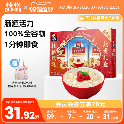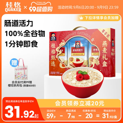 礼盒装,中秋国庆拜节好礼!无添加蔗糖,富含膳食纤维、蛋白质、镁、铁、维生素B1,目前天猫商城quaker桂格旗舰店售价59.9元,领取30元优惠券,实付29.9元包邮,入手好价。