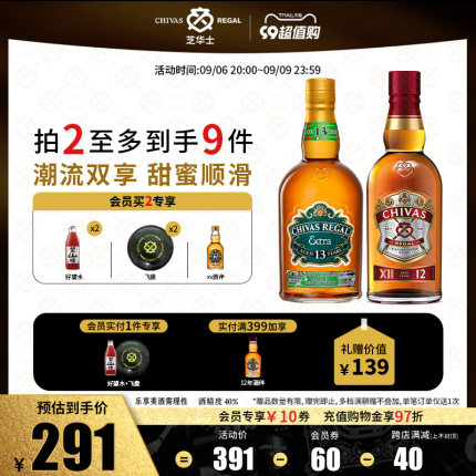 旗舰店发货,领潮风味系列,双瓶礼盒装!当苏格兰威士忌奇遇墨西哥龙舌兰桶 ,热带水果风味,燃动唇齿。目前天猫商城CHIVAS芝华士官方旗舰聚划算特价¥391,可领¥60优惠券,每满300减40,折后实付¥291包邮,套装入手好价。加入店铺会员专享飞盘+望山楂水,单笔实付399元赠12年芝华士酒伴,中秋送人也洋气~