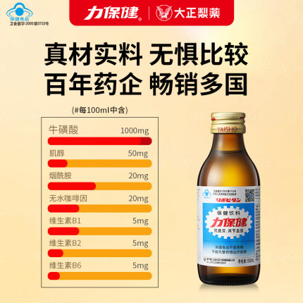 大正制药集团1962年研发,畅销世界60年,每瓶含有1500mg牛磺酸,一口清醒,抗疲劳, 调节血脂。目前天猫力保健旗舰店售价¥109.9,可领取¥60优惠券,叠加跨店满减,实付新低¥39.9包邮,效期至2023/11/25,介意慎拍,入手好价。
