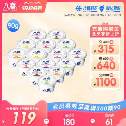 目前90g装天猫商城八喜旗舰店售价¥11,下单15件可领取¥81优惠券,到手实付¥99包邮,折合¥6.6/杯,近期好价,6口味可选,官方旗舰店发货,冷链包邮。
