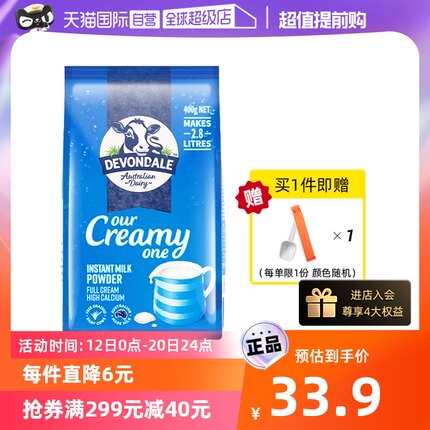 来自澳大利亚天然牧场,口感醇香,天然牛奶,高钙易吸收。目前天猫国际自营全球超级店400g袋装售价¥39.9,下单2件可领取¥18元优惠券,实付¥49.8元包邮,折合¥24.9/袋好价。