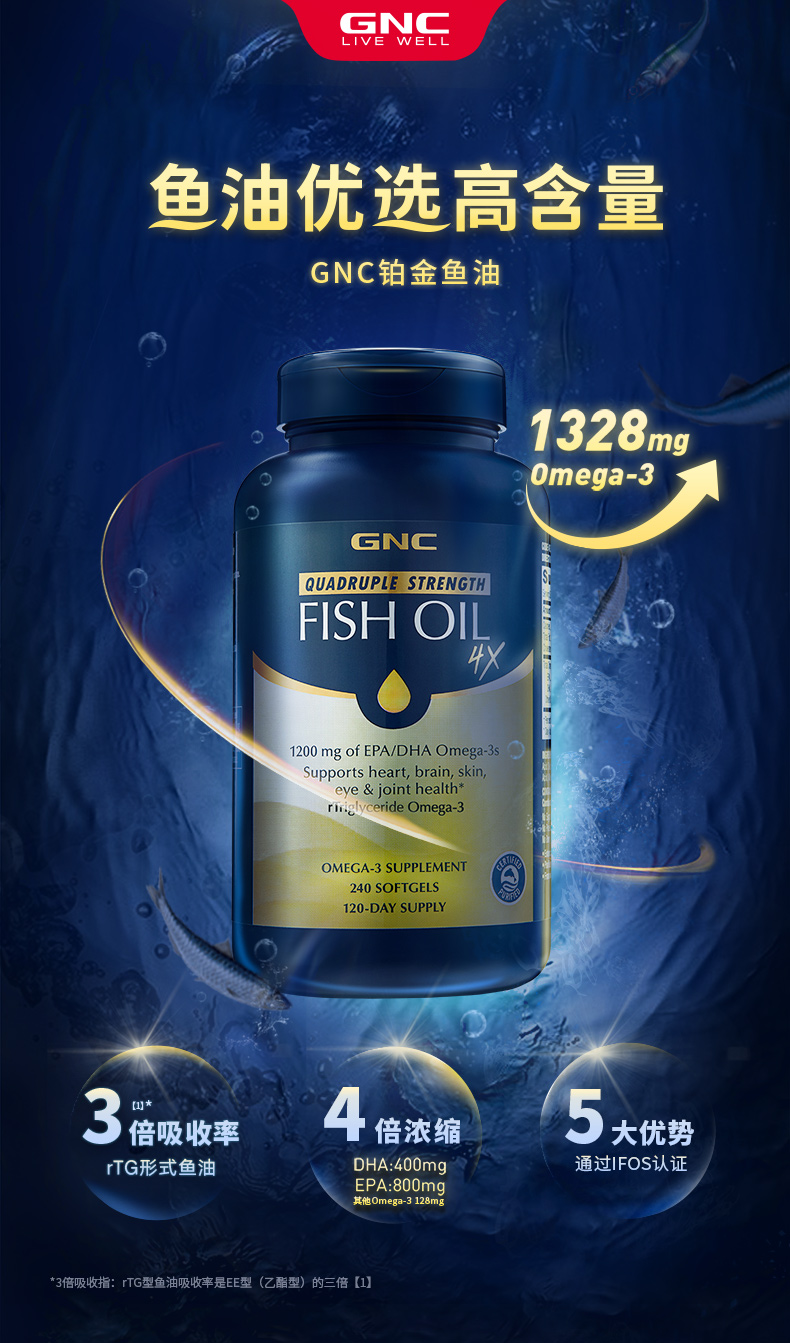 GNC 健安喜 Omega-3四倍冠军鱼油软胶囊,纯净原料产地,挪威进口鱼油,鱼油原料多项指标优于IFOS五星级标准,EPAX原料供应商拥有先进提纯专利技术,带来omega-3含量大于90%的卓越纯度。科技前沿鱼油载体,rTG形式鱼油,三倍吸收率,每份含EPA+DHA高达1200mg,四倍浓缩精华,更高含量,更好吸收。血管清道夫,改善血管和肠道油脂堆积,支持心血管健康,眼脑润滑油,注入大脑眼部活力。小颗粒肠溶包衣,更容易吞服,不反胃酸。