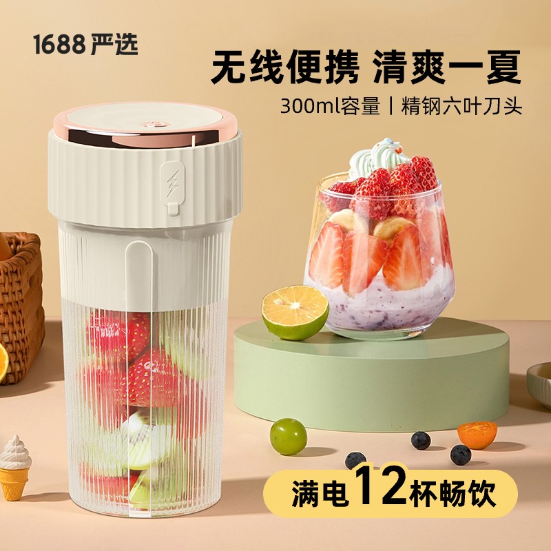 婴儿奶瓶材质,300mL容量,榨好果汁,立马变成随身杯,采用6叶刀头,两端双面长刀头切割大块果蔬,中间短刀头跟随大转速电机,切割细小果汁,长短配合快速切断果蔬纤维,实现细腻口感。