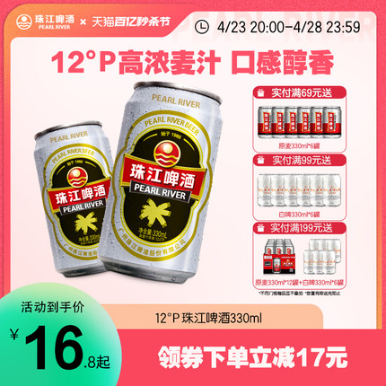 经典老珠江,老广情怀 。12°P高浓度经典老珠江黄啤酒,优质原料,传世麦香,醇香一刻,酣畅淋漓,欢聚美味时刻。目前330mL*12罐天猫商城珠江啤酒旗舰店售价¥53.9,叠加¥18优惠券,官方立减¥7.1,实付¥28.8包邮,近期入手低价。