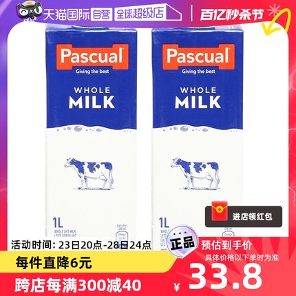 西班牙进口, pascual 帕斯卡 全脂纯牛奶 1L*2瓶23.8元包邮