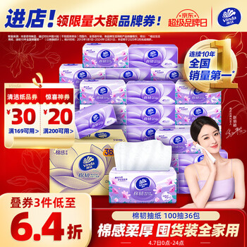 维达 棉韧系列 立体美抽纸(S码)3层100抽*36包*2箱65.36元包邮(0.9元/包)