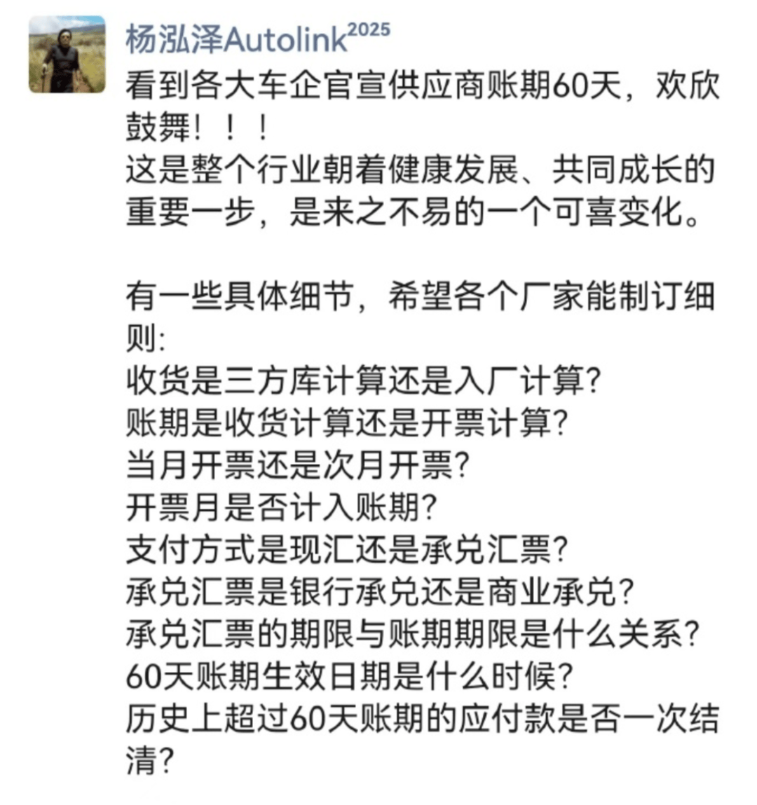 有这个野心不错,但咱不光是产品追上,信用上也得跟那些跨国车企学学。2024 年,丰田、福特、通用的账期在 50-70 天内,德系车企更短,只有 40 天左右。人家做得确实好很多。