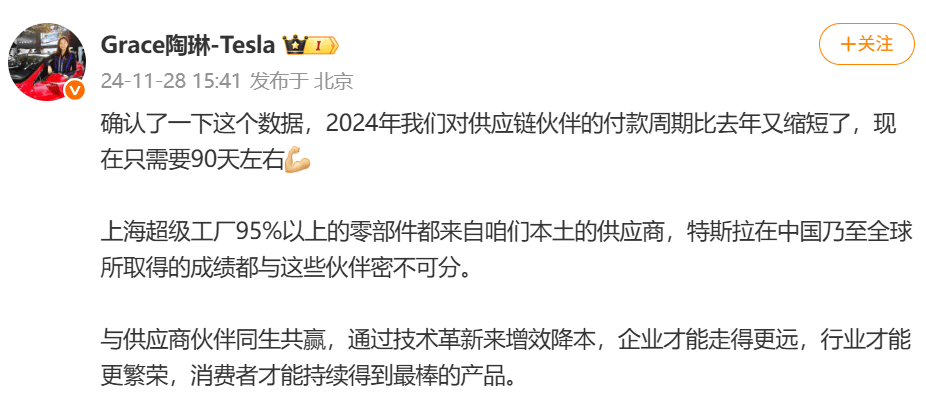 去年,特斯拉副总裁陶琳曾发微博炫耀,说特斯拉的付款周期压缩到了 90 天左右。